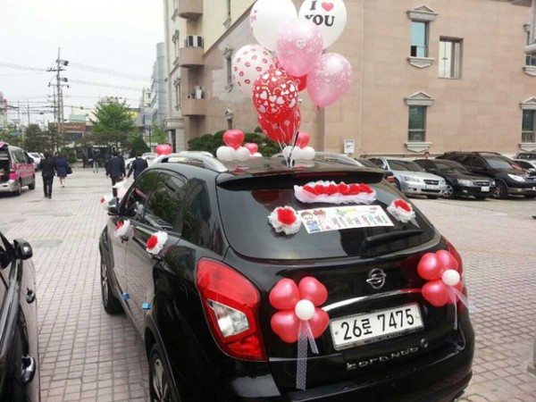 웨딩카로 사용하실 차를 매장앞으로 가지고 오시면 풍선장식가들이 직접 풍선, 레이스, 리본 등을 이용해